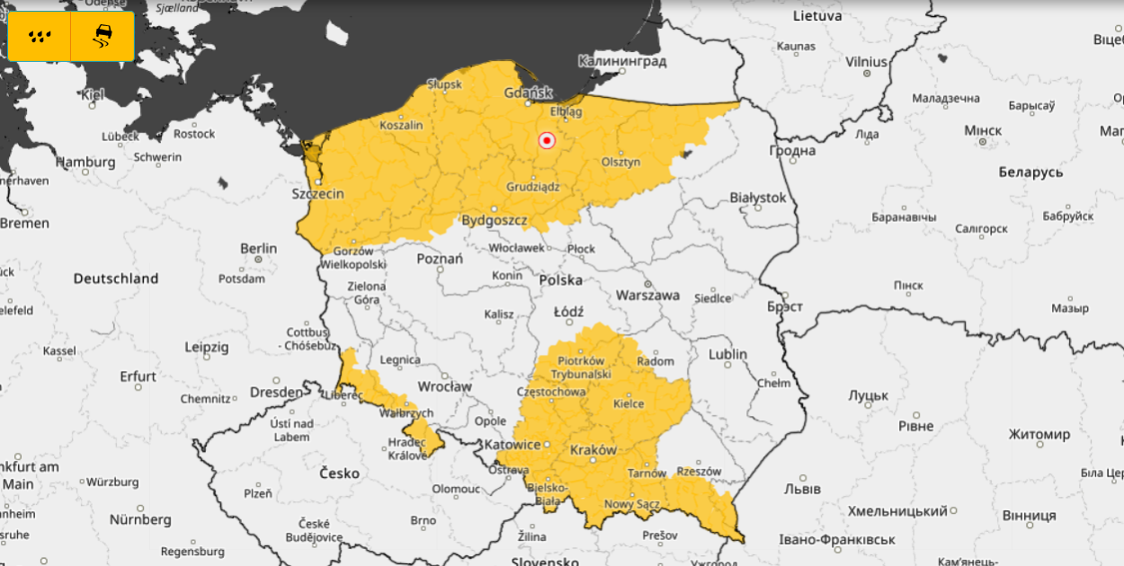Prognozuje się miejscami zamarzanie mokrej nawierzchni dróg i chodników po opadach deszczu, deszczu ze śniegiem lub mokrego śniegu powodujące ich oblodzenie. Temperatura minimalna około -2°C, temperatura minimalna przy gruncie około -4°C.