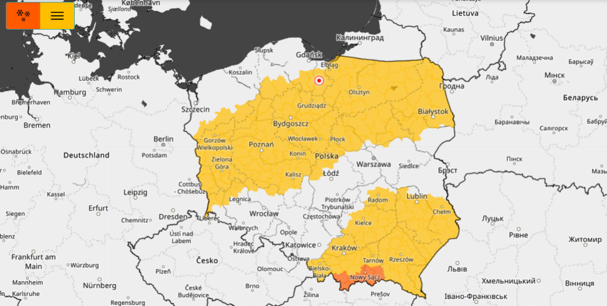 Przez Centralne Biuro Prognoz Meteorologicznych w Warszawie, zostało wydane ostrzeżenie meteorologiczne dla powiatów naszego województwa.