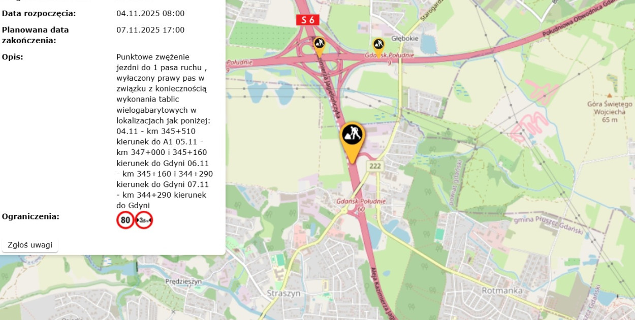 Generalna Dyrekcja Dróg Krajowych i Autostrad informuje, że w dniach 4–7 listopada 2025 r. kierowcy podróżujący drogą ekspresową S6 w rejonie węzła Gdańsk Południe muszą liczyć się z czasowymi utrudnieniami w ruchu. Będą one związane z montażem bramownic drogowych w ramach budowy drugiego odcinka Obwodnicy Metropolii Trójmiejskiej (OMT).