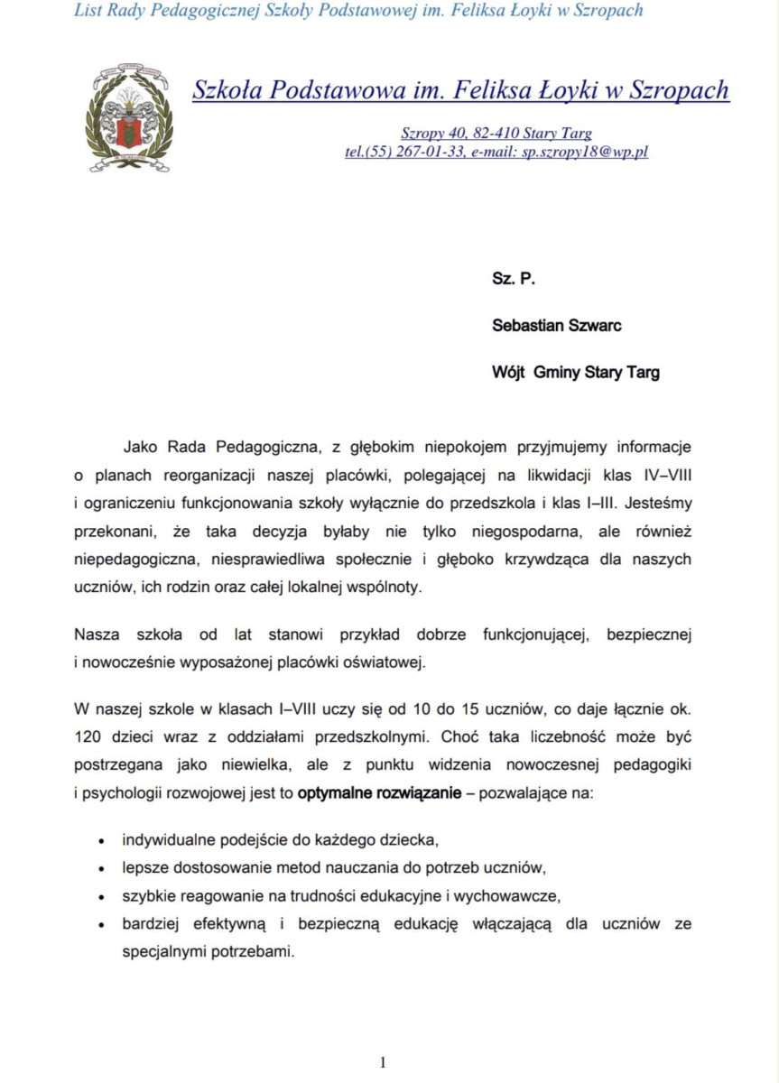 Mieszkańcy Szrop mobilizują się w obronie miejscowej szkoły podstawowej, której przyszłość stanęła pod znakiem zapytania. Na 15 października zaplanowano spotkanie zorganizowane na prośbę Wójta Gminy Stary Targ, podczas którego ma zostać omówiona kwestia reorganizacji szkoły, co – jak podkreślają mieszkańcy – w praktyce oznacza likwidację klas IV–VIII.