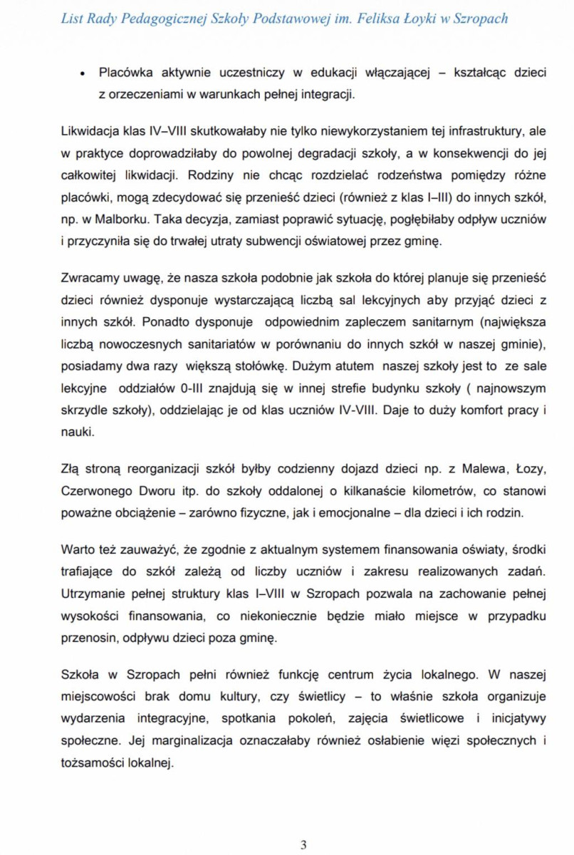 W obronie szkoły mieszkańcy wystosowali pismo do senatora Leszka Czarnobaja, Wiceprzewodniczącego Sejmiku Województwa Pomorskiego Józefa Sarnowskiego, Dyrektora Departamentu Edukacji Urzędu Marszałkowskiego Województwa Pomorskiego Adama Krawca i Pomorskiego Kuratorium Oświaty, prosząc o interwencję i wsparcie w walce o zachowanie szkoły oraz zwrócili się z apelem do wójta Sebastiana Szwarca.