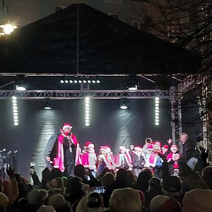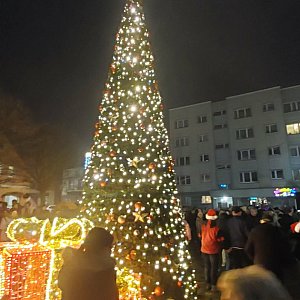 Po krótkich życzeniach i wystąpieniach burmistrza Bartosza Mazerskiego oraz przewodniczącego Rady Miejskiej Waldemara Fierka nastąpił najważniejszy moment wieczoru – uroczyste zapalenie świateł na choince.