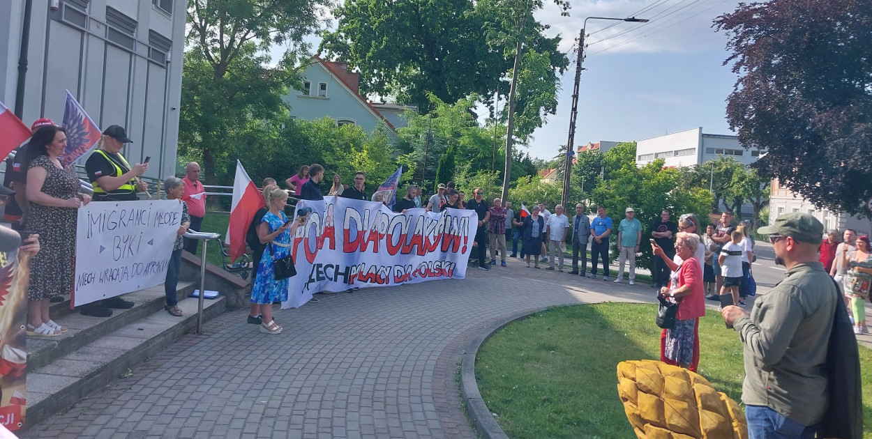 W sobotę, 21 czerwca, przed budynkiem Starostwa Powiatowego w Sztumie odbył się drugi już protest przeciwko planom utworzenia w gminie Centrum Wsparcia Imigrantów. Wydarzenie, zorganizowane przez Łukasza Kuleckiego, zgromadziło licznych mieszkańców, którym — jak sami mówią — na sercu leży bezpieczeństwo lokalnej społeczności.