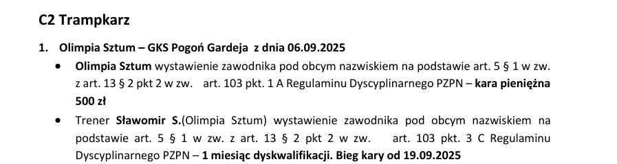 18 września 2025 roku Komisja Dyscyplinarna Podokręgu Malbork Pomorskiego Związku Piłki Nożnej wydała decyzję w bulwersującej sprawie dotyczącej Olimpii Sztum. Klub został ukarany karą finansową w wysokości 500 zł za wystawienie zawodnika pod obcym nazwiskiem. Kara dotknęła także trenera dziecięcej drużyny – Sławomira S., który został zawieszony na 1 miesiąc (od 19 września 2025 r.).