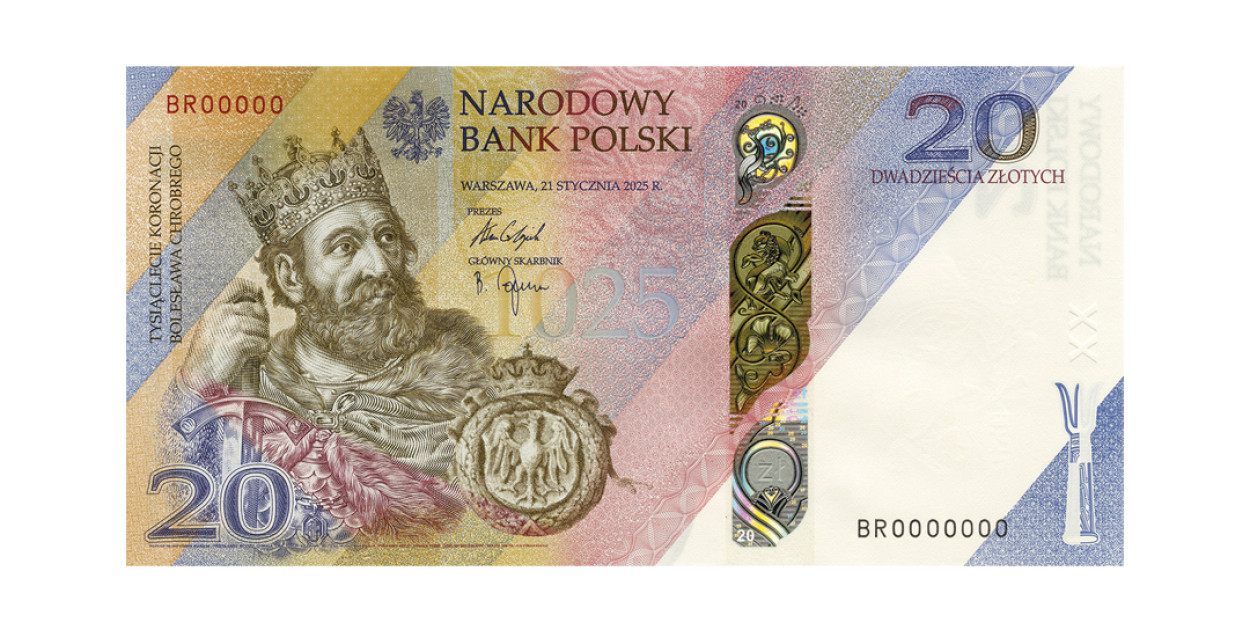 Nowy banknot to hołd dla tej historii. Na awersie znajduje się wizerunek Bolesława Chrobrego, inspirowany grafiką Rudolfa Fryderyka Friedleina. W tle widoczny jest ozdobny pasek zabezpieczający w kolorach złotym i srebrnym, a w świetle UV pojawia się rok koronacji – 1025.