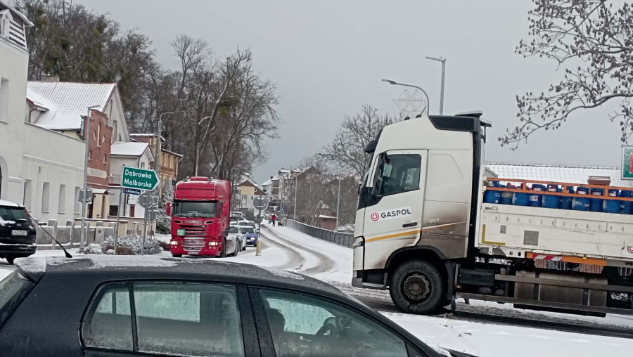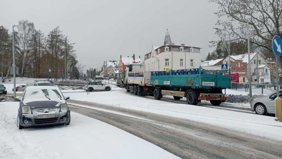 Na drodze krajowej nr 55 w Sztumie doszło do poważnych utrudnień w ruchu. Ciężarówka nie jest w stanie podjechać pod wzniesienie za Rondem Powiśla, co spowodowało zablokowanie drogi w kierunku Malborka.