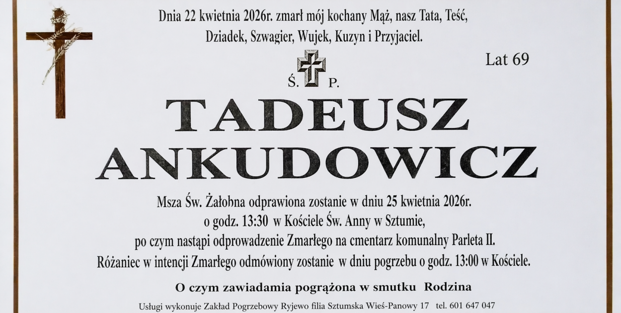 Dziś rano dotarła do nas smutna wiadomość o śmierci Tadeusza Ankudowicza, mieszkańca Sztumu, który zmarł 22 kwietnia w wieku 69 lat.